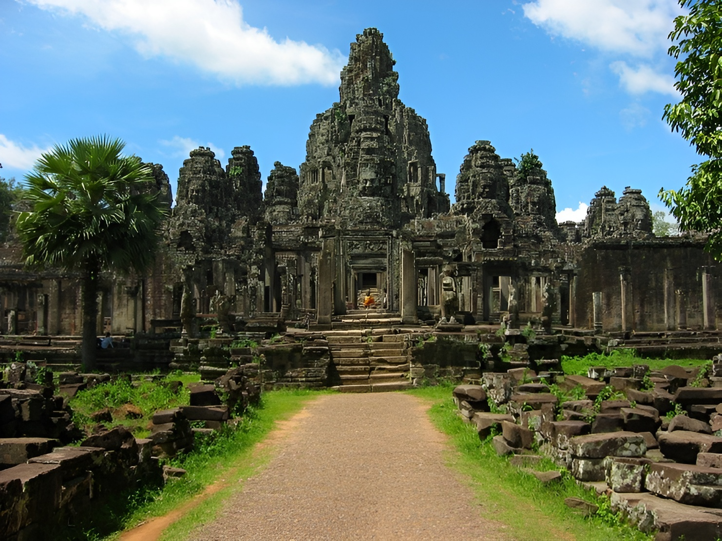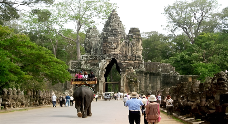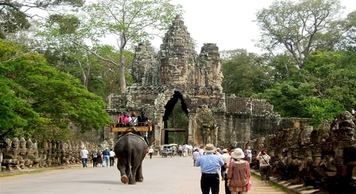 Xe đưa Quý khách ngang qua Đền Bayon – Đây là ngôi đền ấn tượng nhất của kiến trúc đền núi Campuchia do sự hùng vĩ về quy mô cũng như về cảm xúc mà nó đem lại cho Qúy khách; Baphuon – nổi tiếng với tượng Phật nhập niết bàn được chạm khắc trên bức tường đá dài 40 m. Đây được xem là ngôi đền hùng vĩ nhất, vĩ đại nhất chỉ sau Angkor; Quảng trường đấu voi.